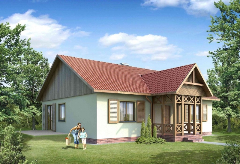Dom drewniany parterowy - szkielet drewniany z nie użytkowym poddaszem, niepodpiwniczony. Dom podzielony jest na dwie strefy dzienną i nocną. Strefa dzienna to hol, kuchnia ze spiżarką, pokój dzienny z kominkiem i wc dostępne z holu, natomiast strefa nocna to trzy sypialnie z łazienką i schowkiem. Dach dwuspadowy kryty dachówką blaszaną. Prosta bryła budynku, wejście do budynku poprzez ganek zadaszony. Wygodny budynek dla cztero osobowej rodziny.