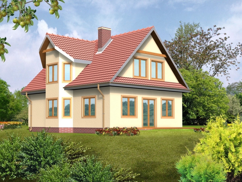 Dom jednorodzinny, parterowy z użytkowym poddaszem i garażem, niepodpiwniczony. Wygodny budynek dla 4-5-cio osobowej rodziny. Dom podzielony jest na dwie strefy: dzienną i nocną. Strefa dzienna na parterze to hol, kuchnia, pomieszczenie gospodarcze, wc, pokój do pracy i pokój dzienny z kominkiem, natomiast część nocna to trzy sypialnie, łazienka z garderobą oraz pomieszczenie gospodarcze nad garażem.