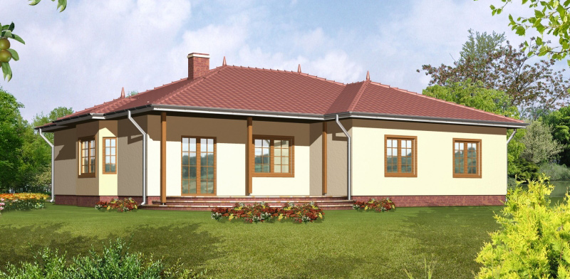 Dom drewniany jednorodzinny, parterowy z garażem, niepodpiwniczony, przeznaczony dla 4-5 osobowej rodziny. Dom podzielony jest na dwie strefy: dzienną i nocną. Strefa dzienna to salon z kominkiem, kuchnia z pomieszczeniem gospodarczym-spiżarka i jadalnią, wc i hol, natomiast część nocna to trzy sypialnie, dwie łazienki, garderoba i pokój do pracy.