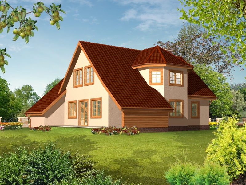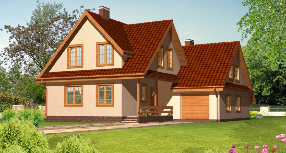 Dom jednorodzinny, parterowy z użytkowym poddaszem i garażem. Wygodny budynek dla 4-5-cio osobowej rodziny. Dom podzielony jest na dwie strefy: dzienną i nocną. Strefa dzienna na parterze to hol, wc, pomieszczenie gospodarcze, kuchnia, pokój dzienny z kiminkiem i gabinet na poddaszu, natomiast część nocna to cztery sypialnie i łazienka z garderobą.