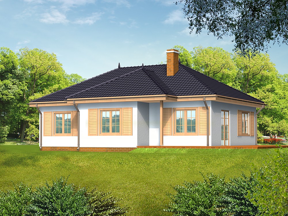 Dom drewniany parterowy z garażem - szkielet drewniany, przeznaczony dla 4-5 osobowej rodziny. Zostały wydzielone dwie strefy, dzienna na parterze to sień, hol, salon, kuchnia, wc, natomiast część nocna to trzy sypialnie i łazienka.