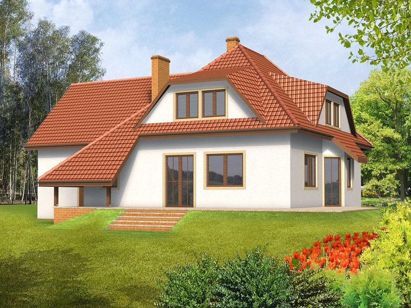 Dom jednorodzinny, parterowy z użytkowym poddaszem i garażem. Wygodny budynek dla 5-6-cio osobowej rodziny. Dom podzielony jest na dwie strefy: dzienną i nocną. Strefa dzienna na parterze to hol, jadalnia, kuchnia, pokój dzienny, kotłownia, wc, natomiast część nocna to cztery sypialnie z łazienką i wc.