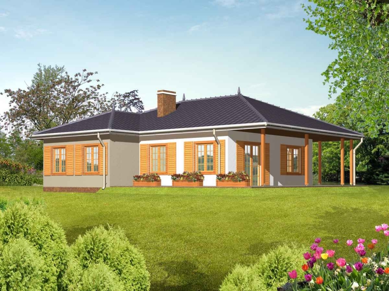 Dom drewniany jednorodzinny, szkielet drewniany parterowy bez garażu, niepodpiwniczony, przeznaczony dla 3-4 osobowej rodziny. Dom podzielony jest na dwie strefy: dzienną i nocną. Strefa dzienna to pokój dzienny z kominkiem, kuchnia, wc, hol, i spiżarka, natomiast część nocna to trzy sypialnie z łazienką. Na zewnątrz od ogrodu zaprojektowano zadaszenie z miejscem na grilla.